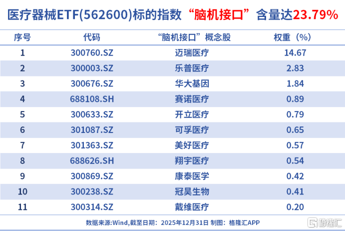 据统计,医疗器械ETF(562600)的“脑机接口”含量达到了23.79%,从指数维度看是全市场脑机接口概念含量最高的指数;迈瑞医疗其第一大权重股,另外乐普医疗、华大基因等这些布局脑机接口相关业务的企业,也都是指数成份股。