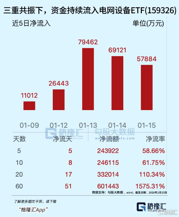 作为全市场唯一一只投向电网设备板块的ETF产品,电网设备ETF(159326)近5日资金净流入超24.39亿元,近20日吸金超33.2亿元,最新规模69.16亿元,近1个月规模增长超129.8%。