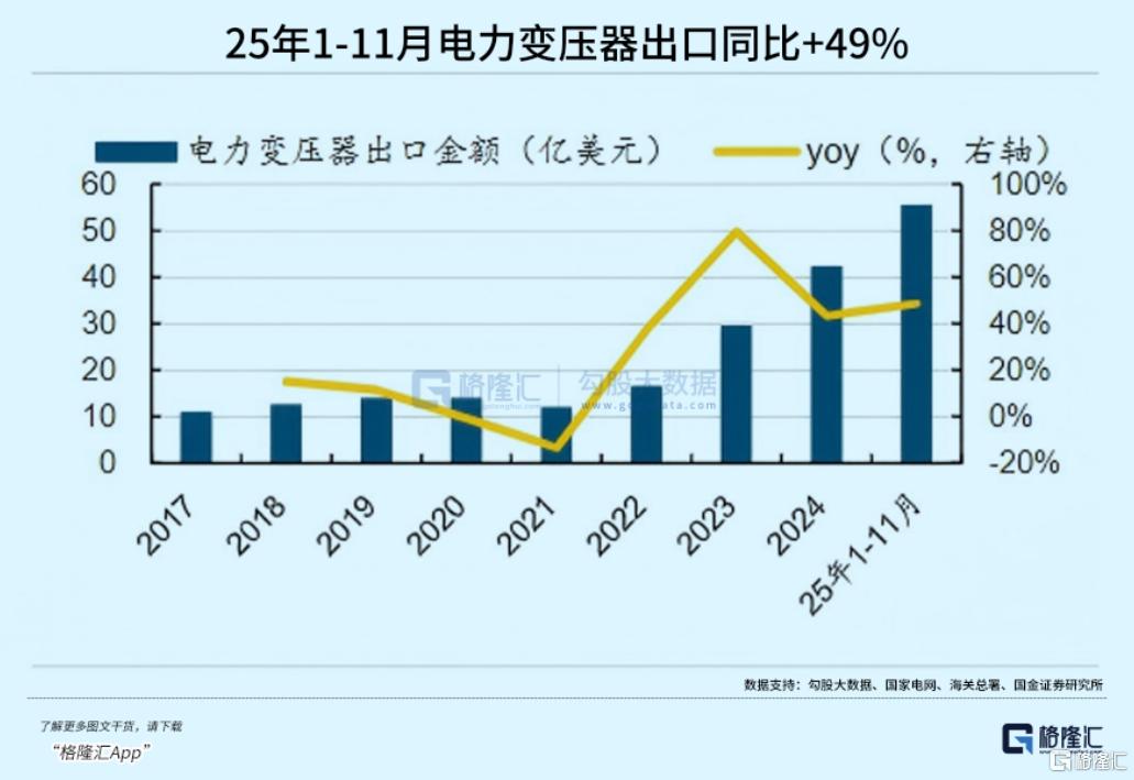 这种“外溢效应”已经在2025年的出口数据中得到了验证。2025年1月-11月,电力变压器出口金额达到55亿美元,同比增长49%。