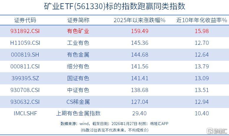 从历史表现来看,矿业ETF(561330)标的指数指数自2025年以来涨幅超159%,在主流有色指数中位居第一,近十年年化涨幅15.97%,同样显著领先。