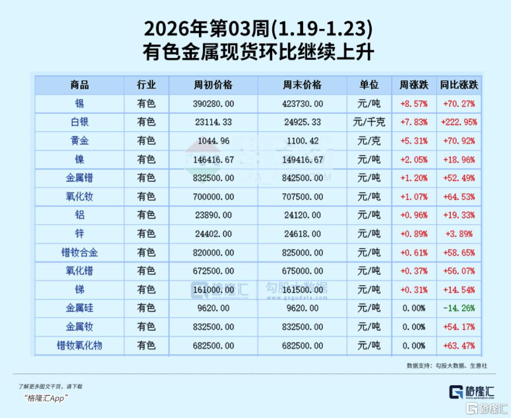 另外,生意社数据显示,2026年第03周(1.19-1.23)大宗商品价格涨跌榜中有色板块环比继续上升,除白银黄金外,锡、镍、锂(碳酸锂)、镨、钕等金属周度明显上涨(实际月度涨幅更大)。