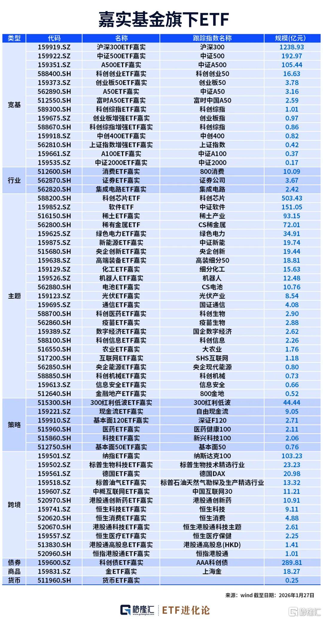 根据Wind数据,截至2026年1月27日,嘉实基金旗下ETF达61只,覆盖宽基、行业、债券、跨境、商品等多元资产,ETF总规模合计3138.3亿元。