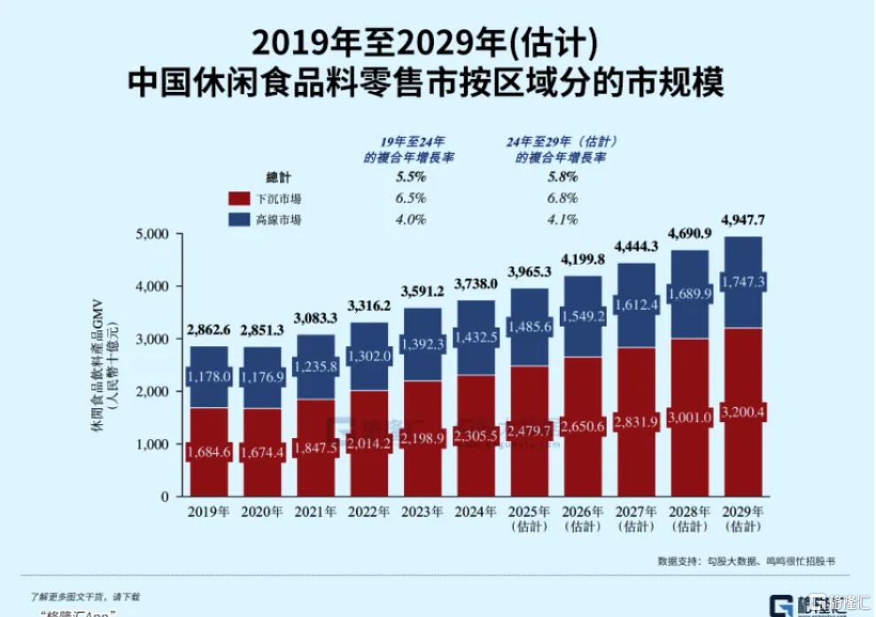 根据国家统计局与弗若斯特沙利文的报告,2019年至2024年,中国休闲食品饮料零售行业市场规模从2.9万亿元(单位:人民币,下同)增长至3.7万亿元,复合年增长率为5.5%,预计于2029年将进一步扩大至4.9万亿元。