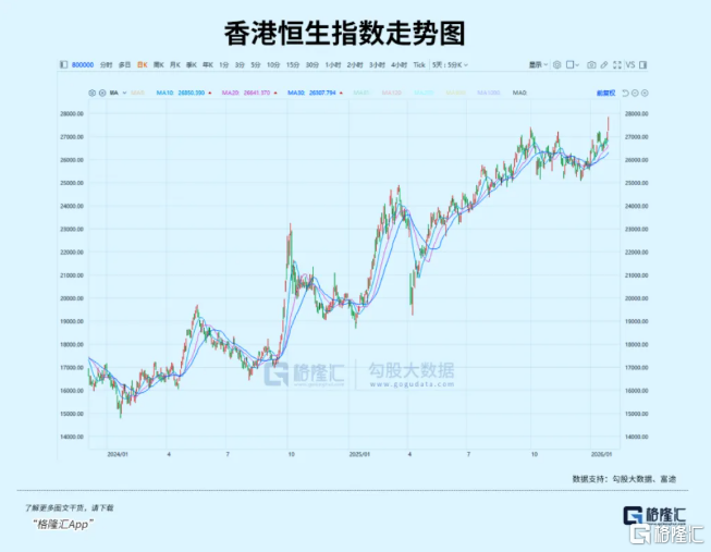 当前,这些资金迁徙的轨迹或已逐渐清晰显现:大宗商品市场上,黄金、白银、铜等贵金属持续刷新历史新高,成为抗通胀的传统锚点;权益市场中,亚太资产成为资金避风港——韩国股指强势攀升,总市值反超德国股市;中国台湾加权指数连续两日创下历史新高,并向33000点整数关口稳步迈进;香港恒生指数更在1月28日突破27700点,创下2021年7月以来近4年半新高,南向资金与外资回流形成共振,交投活跃度较此前进一步放大。