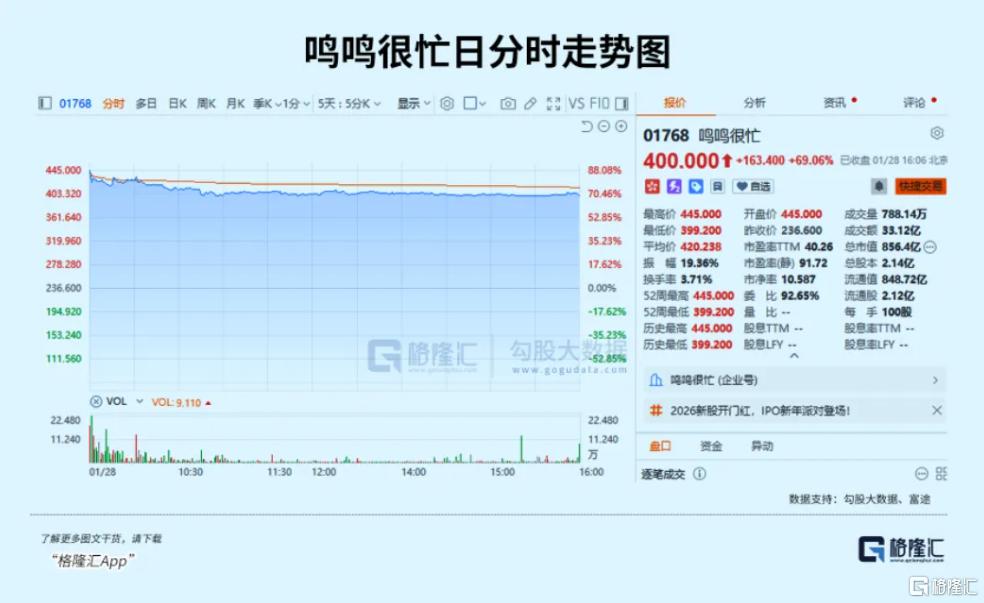 作为“港股量贩零食第一股”,鸣鸣很忙上市首日开盘即大涨88.08%,最高触及445港元,对应总市值突破950亿港元,截至发稿涨幅收窄至70%附近,上演了一场现象级行情。