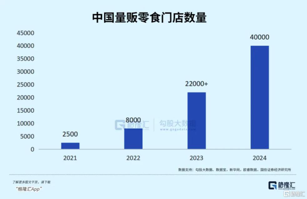 因此,可以看到,量贩零食业态呈现爆发式增长态势。据国信证券数据,全国量贩零食门店数量从2021年的2500家激增至2024年的40000+家。