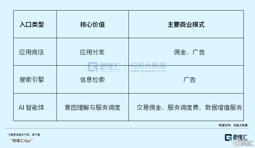 由此,互联网核心入口的估值逻辑也正在发生根本性重构。传统应用商店的价值在于应用分发能力,其商业模式主要是向开发者收取佣金或广告费。搜索引擎的价值在于信息检索和商业意图的捕捉,商业模式以广告为主。而AI智能体的价值则在于“意图理解”和“服务调度”能力,其商业模式更多元、更深层。