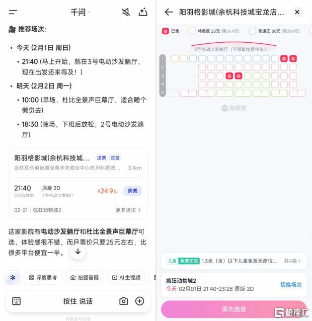 正如上文提到的,千问APP宣布已在1月提前接入了淘宝、支付宝、飞猪、高德等核心场景,开始测试“意图直达服务”的闭环。而有用户注意到,在千问内询问电影信息时,可直接完成选座与购票。据内部人士透露,AI买电影票功能正在灰度测试,即将全面开放。