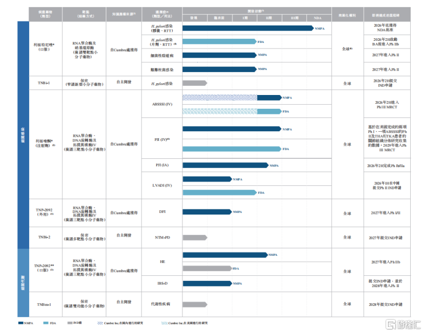 依托这一技术平台,丹诺医药目前拥有7项创新资产组成的差异化在研管线,覆盖幽门螺杆菌感染、植入体相关细菌生物膜感染、肝硬化肝性脑病及腹泻型肠易激综合征等重大未满足临床需求领域。所有管线产品均拟作为一线或初始治疗方案,呈现明确梯队布局:1项临近商业化阶段(利福特尼唑)、2项处于后期临床开发阶段(利福喹酮注射剂和TNP-2092口服制剂)、1项获IND批准及3项处于临床前阶段。