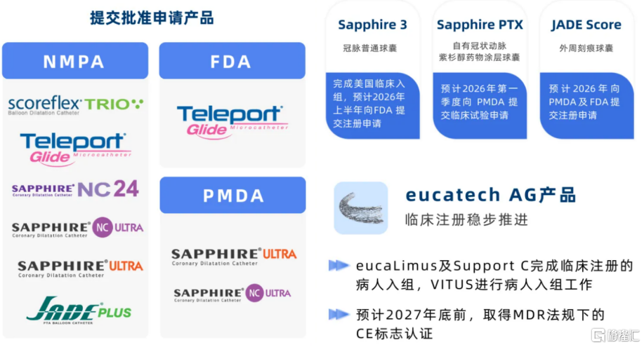在研管线方面,公司已向FDA、PMDA及国家药监局提交7款产品注册申请。另外,公司拥有丰富的产品管线,其中自有冠脉紫杉醇药物涂层球囊Sapphire PTX预计将于2026年第一季度向日本PMDA递交临床试验申请。这些丰富而处于不同阶段的产品管线,为公司日后持续增长提供源源不断的动力。