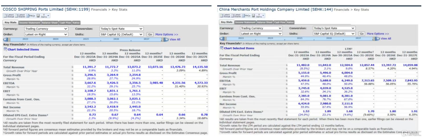 我们也看到了华尔街机构对这两家港口上市企业的未来长期的盈利增长率g推断都是有所差别的。根据标普500旗下Capital IQ平台提供的数据显示,机构投资者对中远海运港口、招商局港口未来两年(即26和27年)每股EPS增长的一致性预期分别为10%和6%,显然地,在机构投资者眼中,前者有着更高的长期盈利增长率g,因而可支撑ROE长期向上的改善。