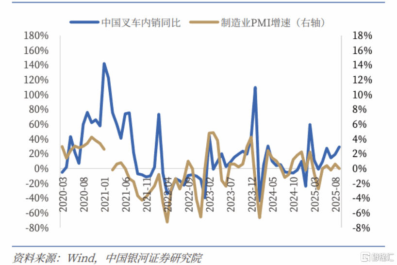 从政策导向来看,场内物流设备下游应用广泛,其销量通常与宏观经济和制造业景气度正相关。如下图所示,中国月度叉车内销增速与制造业PMI增速表现出较高的匹配度。