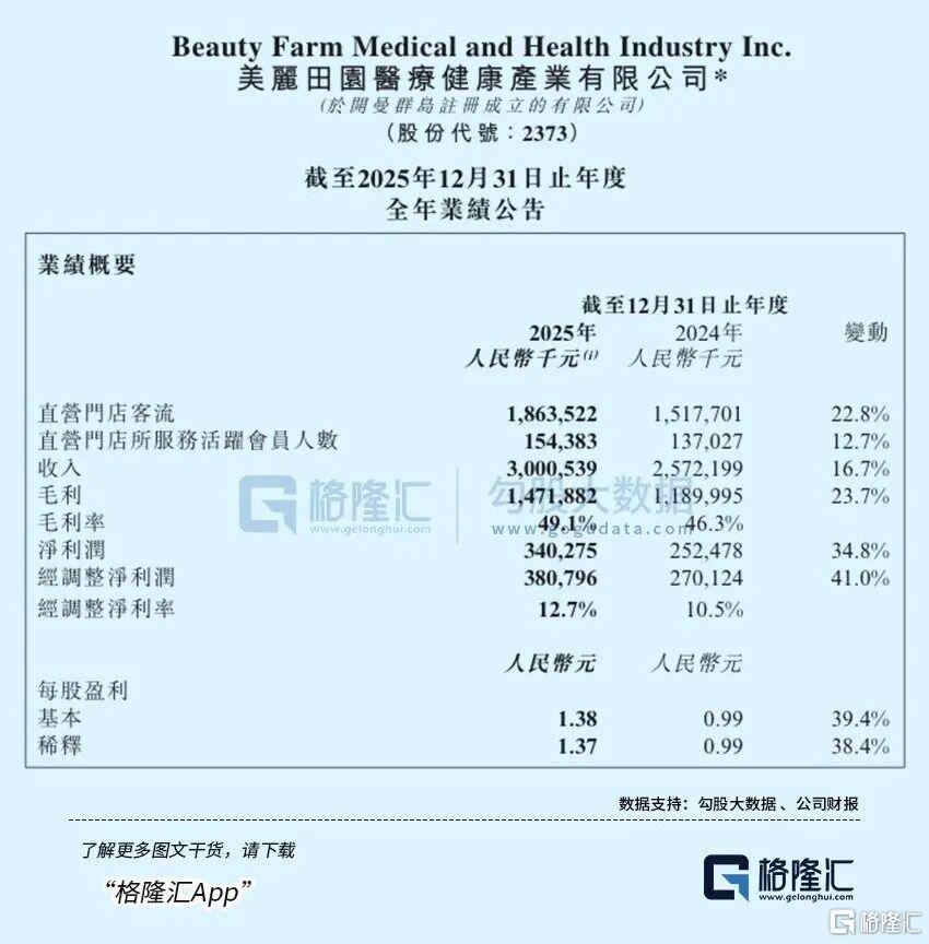 然而美丽田园走出了不同的曲线。过去的2025年,公司收入增长16.7%,经调净利润却以41.0%的速度狂奔。2023年公司毛利率45.6%,2025年跃升至49.1%。