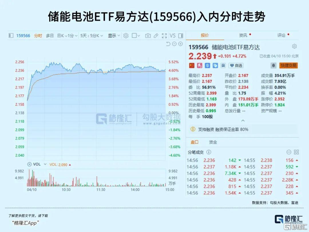 ETF端同样呈现资金涌入态势,电池ETF易方达(159175)大涨4.46%,储能电池ETF易方达(159566)涨超4.72%,近20日资金净流入22.55亿元。