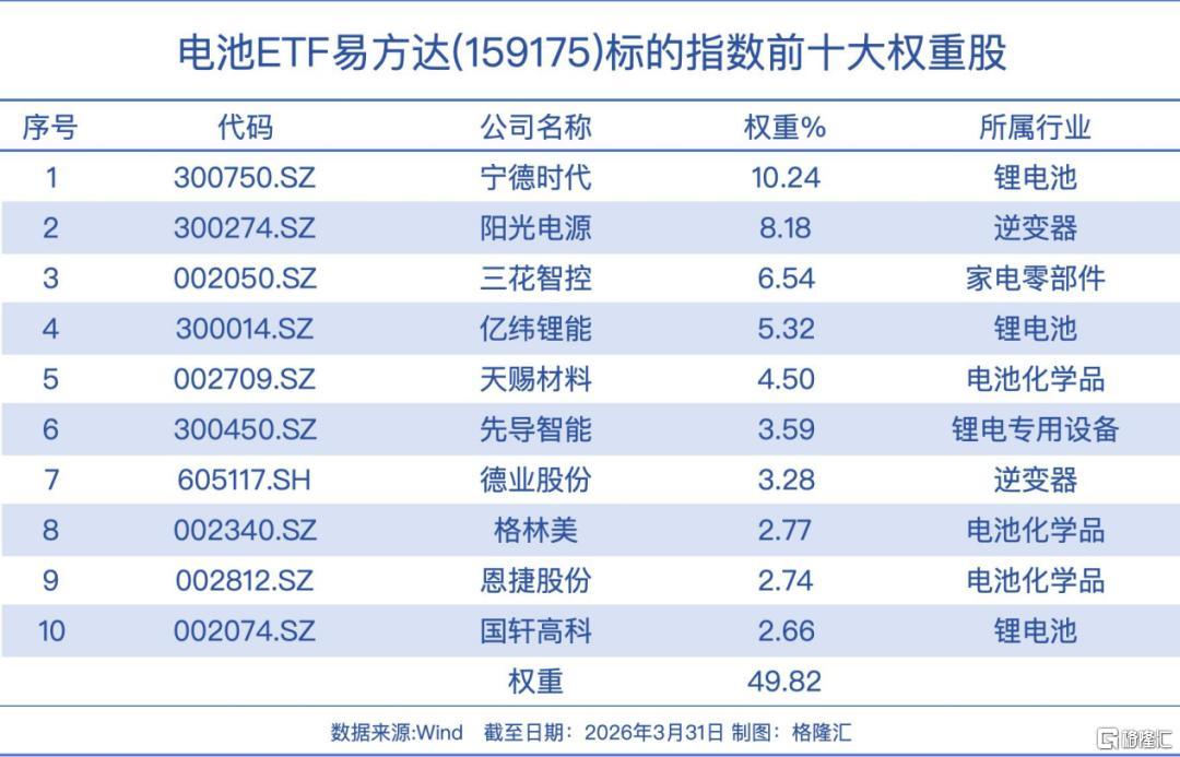 电池ETF易方达(159175)跟踪中证电池主题指数,覆盖动力电池、储能、消费电子电池全产业链,聚焦宁德时代、三花智控、阳光电源等行业龙头,其综合费率0.2%/年,为同类最低。