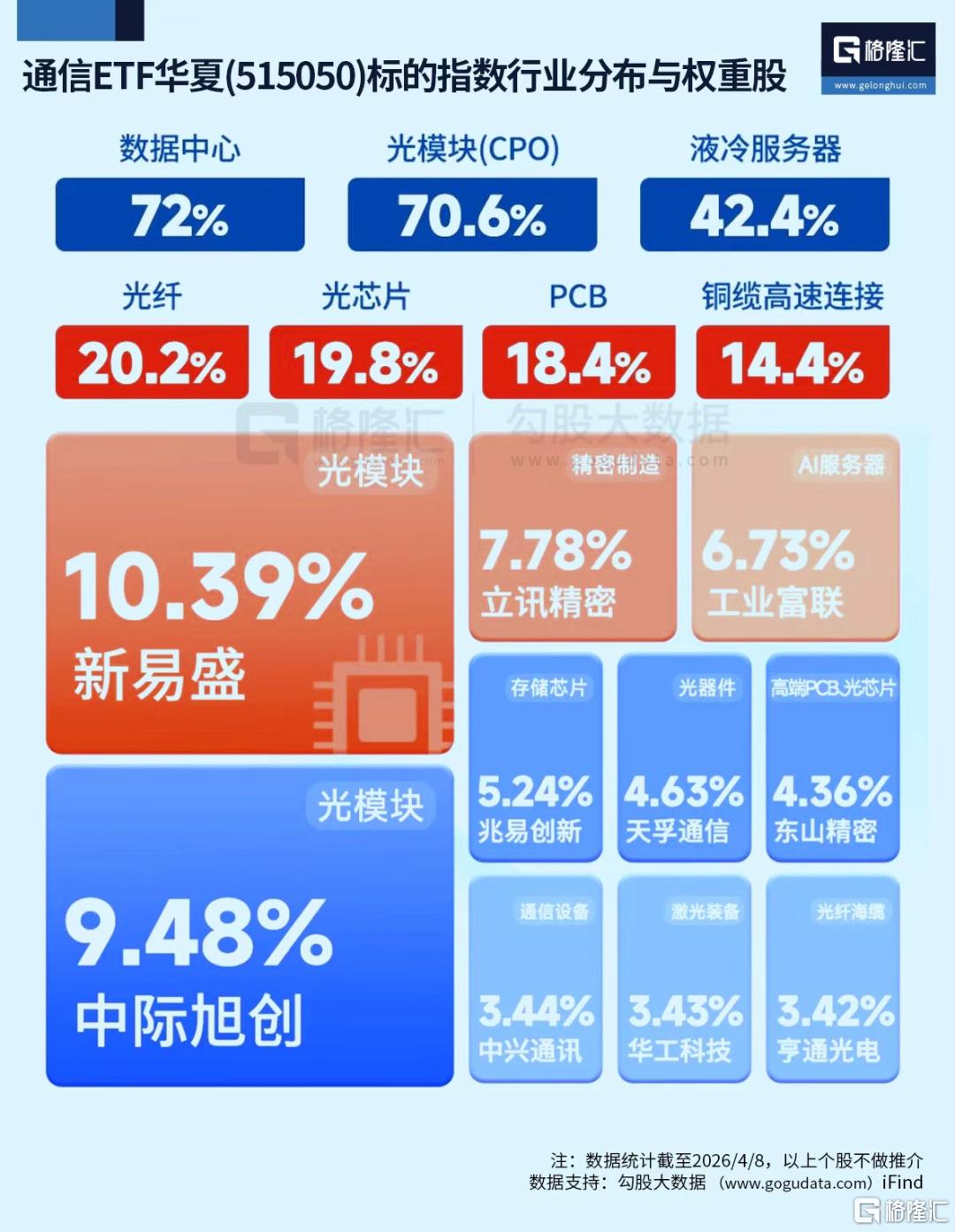 通信ETF华夏(515050)聚焦AI算力龙头,标的指数中光模块CPO概念股权重占比达70.6%,光纤、光芯片占比均超19%,PCB电路板占18.4%,此外散热核心——液冷服务器概念股权重达42.4%,覆盖通信算力硬件全产业链生态,权重股中新易盛、中际旭创、天孚通信三大光模块龙头公司合计权重24.5%。