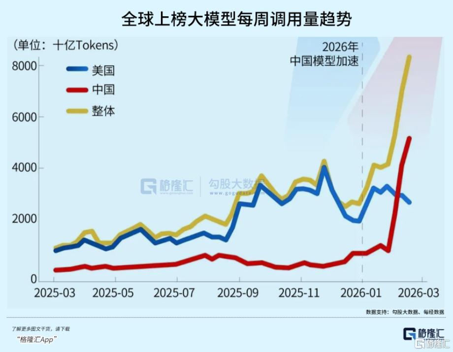 国家数据局数据显示,2026年3月,中国日均Token调用量已突破140万亿次,相较2024年初增长超1400倍 。在OpenRouter平台上,2026年3月中国AI大模型周调用量达到7.36万亿Token,超越美国。