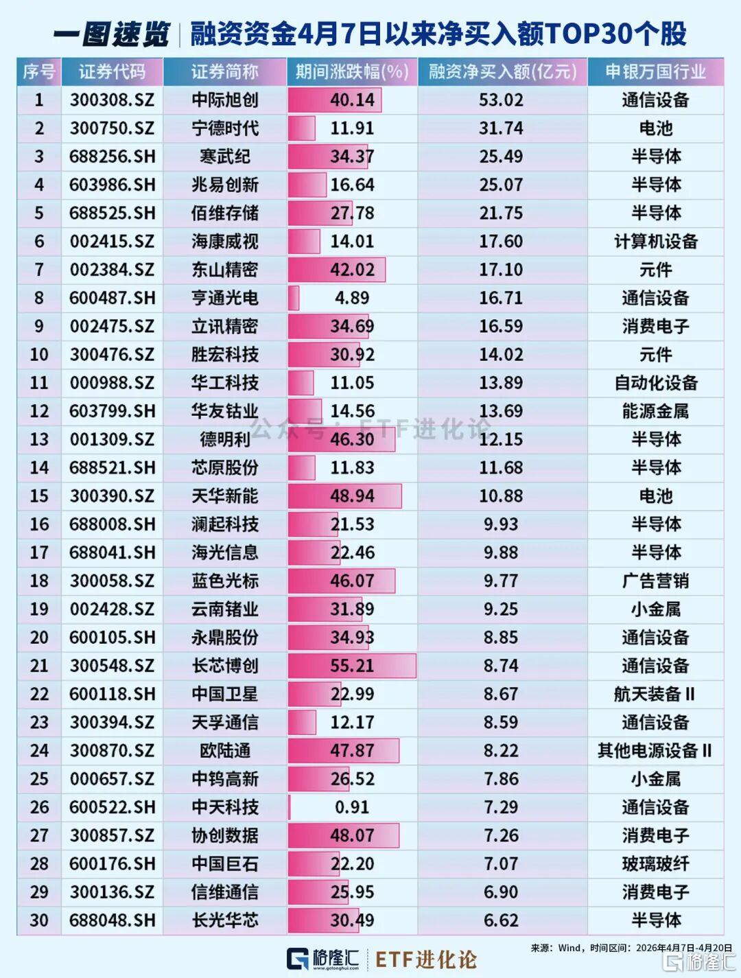 融资资金聚焦于电子、通信和电力设备三大板块,净买入居前的个股包括中际旭创、宁德时代、寒武纪、兆易创新、佰维存储等。