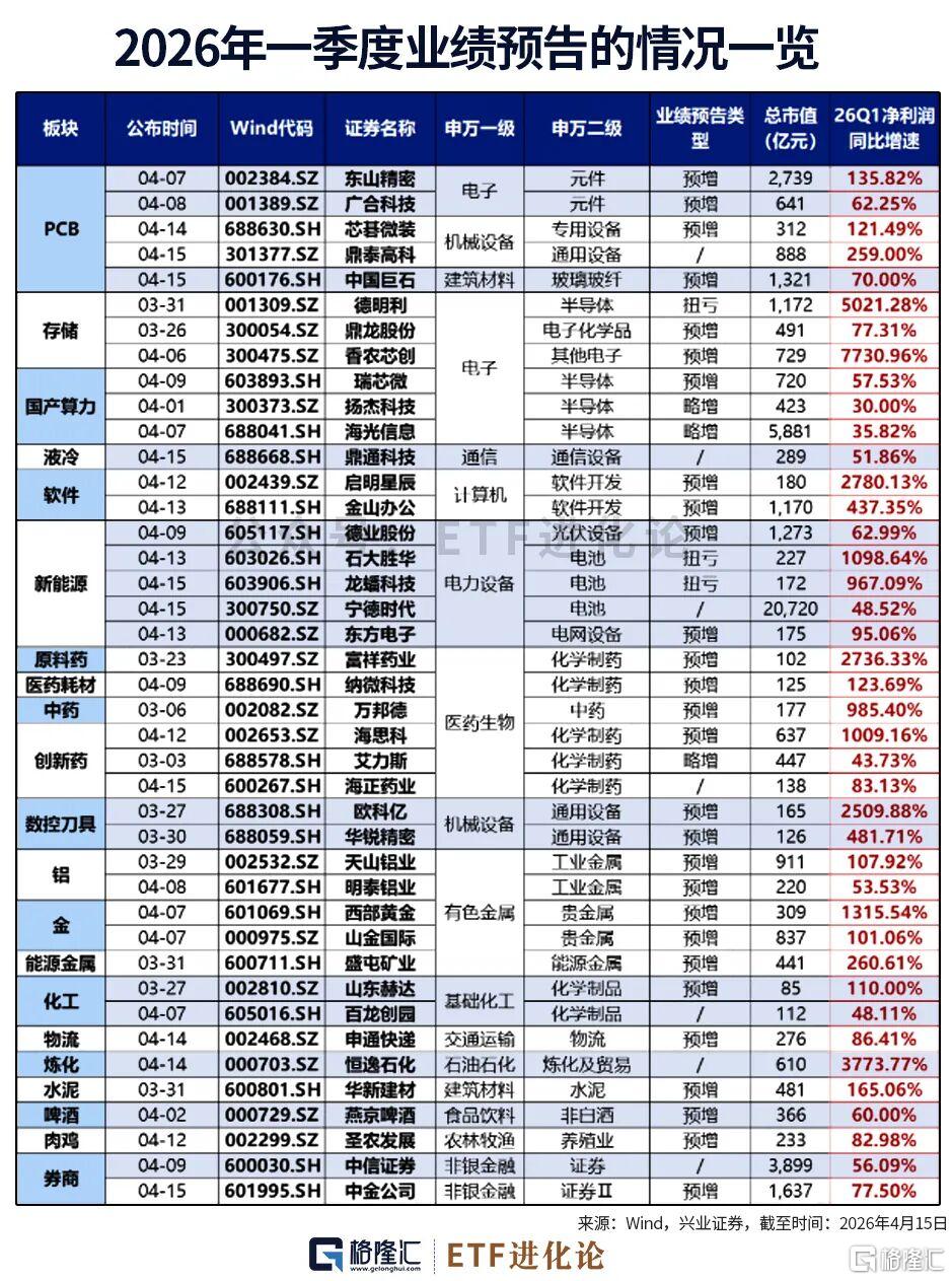 今年一季报预告透露的盈利方向主要集中在:半导体(存储、国产算力)、液冷、新能源(电池储能、光伏、电网)、创新药、有色等细分领域。