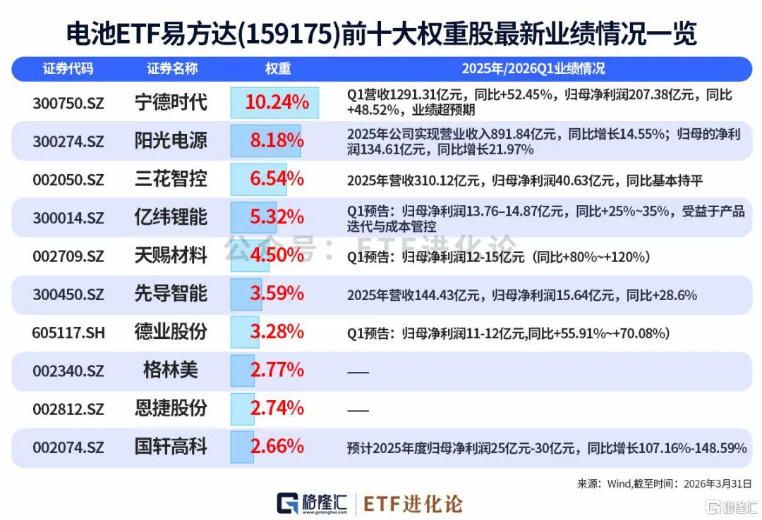 以电池ETF易方达(159175)、储能电池ETF易方达(159566)的权重股为例,宁德时代、天赐材料的一季度业绩均超市场预期。