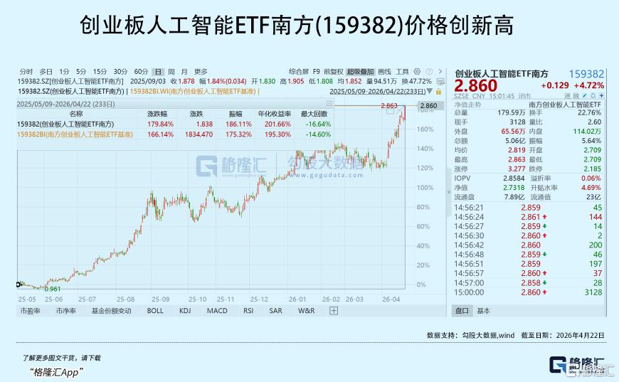 ETF方面,创业板人工智能ETF南方(159382)近1个月日均成交额1.52亿元,最新规模21.56亿元,交投活跃。