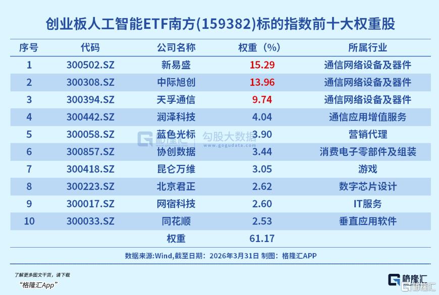 创业板人工智能ETF南方(159382)跟踪创业板人工智能指数,该指数被誉为全市场特色鲜明的"高光"指数,聚焦光模块等核心赛道,覆盖行业龙头,“易中天”(新易盛、中际旭创、天孚通信)含量达38.99%。
