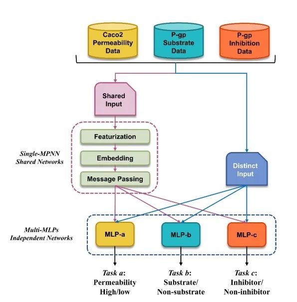生物膜和转运体对小分子药物的口服吸收产生重要影响。具有合适生物膜渗透性的药物可被肠道充分吸收从而表现出良好的口服生物利用度;药物与转运体的相互作用影响其药理活性,若药物作为底物被转运体外排将导致活性减弱而作为转运体抑制剂则导致活性提升。Caco2细胞系培养是开展药物肠道吸收与转运体相互作用体外实验的关键技术,然而其培养周期长、实验条件敏感且污染风险高,因此测试成本高昂。使用机器学习方法对专有数据建模可快速且低成本地预测药物与生物膜及转运体的相互作用,从而在早期开展药代动属性优化。研发团队对内部Caco2细胞渗透性测试实验记录进行了数据抽提及标准化,共获得包含膜渗透、转运体底物、转运体抑制三个任务在内的有效数据,为创新模型构建提供了高质量的专有训练、验证数据集。