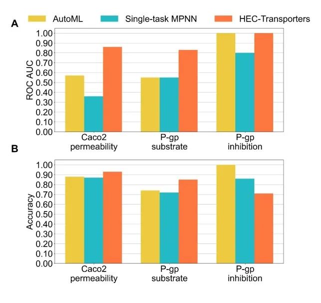 HEC-Transporters整体架构如图1所示,该模型创新性在于使用多任务学习策略进行数据及模型层面的透膜与转运任务联合建模。首先,数据被划分为共享型与特异型,前者样本分子约占总样本的80%,在三个任务中均出现,因而用于训练一个通用的消息传递网络以捕捉分子与生物膜作用的共同结构特征;后者则在各自任务中特异出现,因此分别用于训练独立的前馈神经网络以提升模型在专有任务上的表现。研发团队将HEC-Transporters与当前先进的自动机器学习建模方法进行了比较研究,内部数据集基准测试结果如图2所示:多任务学习模型平均AUC高达0.90,较单任务模型提升0.33,较基线模型提升0.19;准确率结果显示,多任务策略在膜渗透性任务上准确率最高,达到93%,而对转运体底物预测提升效果最佳,较单任务模型提升18.0%,较自动化机器学习模型提升12.2%。