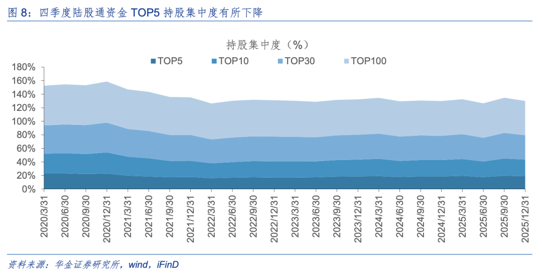 (2)持仓规模变动和净流入上,通信、有色、电新等成长龙头股增量较多。因净买入数据暂停披露,该行使用陆股通资金持仓规模变动代替,并通过剔除价格因素估算净流入数据:首先,估算数据来看四季度外资净流入最多的5只标的分别为宁德时代(88.13亿元,电新)、立讯精密(+57.37亿元,电子)、潍柴动力(+51.24亿元,汽车)、招商银行(46.64亿元,银行)、北方华创(+39.02亿元,电子),四季度净流出最多的标的包括贵州茅台(-86.96亿元,食品饮料)、药明康德(-62.09亿元,医药)、迈瑞医药(-44.53亿元,医药);其次,四季度持仓市值增加最多的是中际旭创(+137.98亿元,通信)、中国平安(+99.35亿元,非银),思源电气(+85.55亿元,电新),持仓市值减少最多的为贵州茅台(-123.30亿元,食品饮料),宁德时代(-113.16亿元,电新),迈瑞医药(-101.26亿元,医药)。(3)持股集中度上,四季度陆股通资金TOP5持股集中度为18.96%(-0.71pcts),TOP10为24.67%(-0.78pcts),TOP30为35.86%(-1.84pcts),TOP100为50.74%(-1.26pcts),外资配置龙头依然显著,但趋势有所下降。