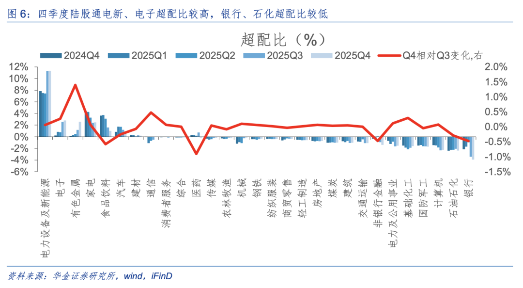 四季度有色金属、通信、化工持仓规模上升,医药、食品、汽车持仓规模下降。(1)持仓上:首先,2025年四季度(12月31日数据,下同)中信一级行业中陆股通持仓规模最大的行业分别是电新(占比17.78%,较上季度-0.12pcts,下同)、电子(13.91%,-0.33pcts)、有色金属(7.18%,+1.96pcts);其次,持仓规模上升较多的行业是有色金属(7.18%,+1.96pcts)、通信(3.48%,+0.77pcts)、基础化工(3.69%,+0.48pcts),下降较多的行业是医药(5.71%,-1.59pcts)、食品饮料(5.43%,-0.91pcts),汽车(4.75%,-0.57pcts)。