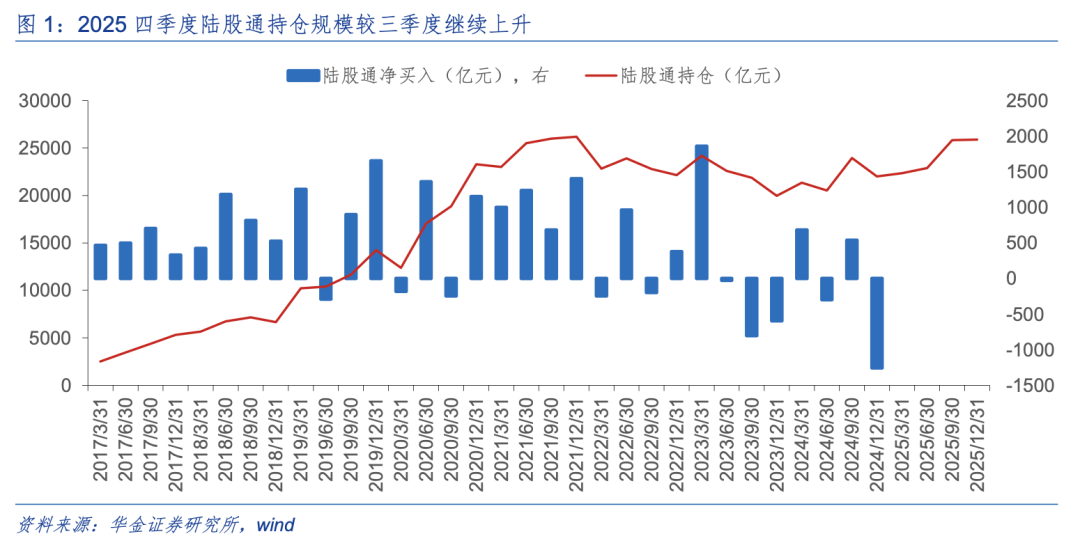 2026年一季度陆股通资金可能加仓核心资产、科技和周期行业。(1)陆股通资金后续可能持续流入。一是当前美联储降息周期未完,一季度美联储可能再度降息,美国债务和美元信用风险上升,可能进一步促使外资加速流入 A 股市场。二是外资的流入情况与我国基本面表现相关性较强,全A年报盈利增速较三季报有望继续有所回升,A股盈利仍处于回升周期中,且落实和细化“十五五”规划的政策方案后续可能逐步出台,有望推动基本面预期修复,外资有望持续流入A股。