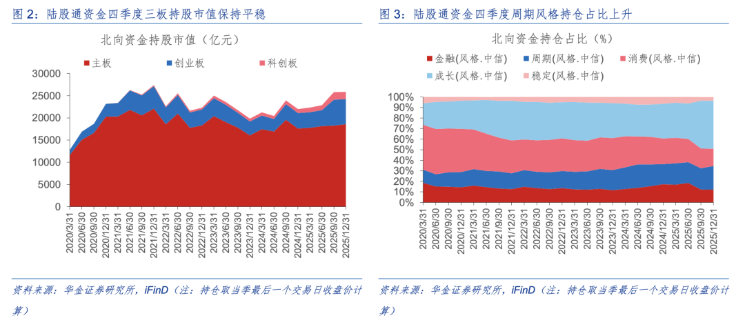 四季度陆股通持仓继续上升,主板持仓占比小幅上升,周期板块持仓占比上升。首先,整体来看,2025年四季度陆股通持仓总规模接近2.59万亿元,较上季度环比增加54.06亿元。其次,变化上:板块方面,2025Q4陆股通资金主板持仓占比较2025Q3小幅度上升1.04pcts,创业板下降0.65pcts,科创板下降0.39pcts;风格方面,2025Q4周期、成长、稳定风格陆股通资金持仓占比环比上升2.37pcts、0.08pcts、0.05pcts,消费、金融风格分别下降2.37pcts、0.15pcts。