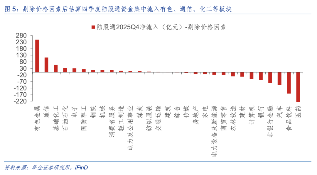 (2)净流入上,因个股及行业陆股通资金流入数据暂停披露,该行通过剔除持仓的价格因素对净流入数据进行估算:四季度有色金属(+248.72亿元)、通信(+112.78亿元)、基础化工(+57.11亿元)外资流入较多,而医药(-256.65亿元)、食品饮料(-161.45亿元)、非银(-80.01亿元)外资流出较多。