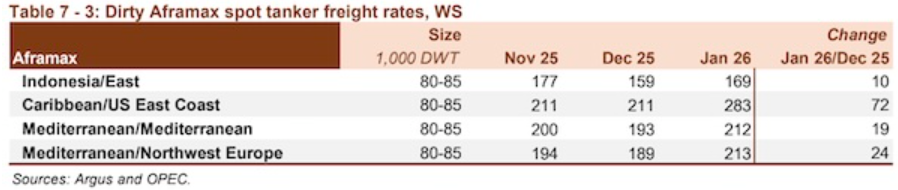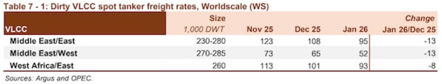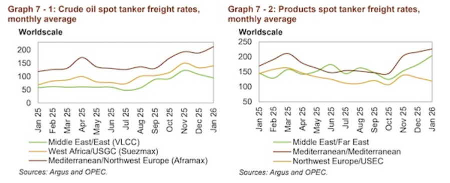 智通财经APP获悉,欧佩克在最新月度报告中表示,油轮市场在2026年开局表现积极。在地缘政治不确定性、天气干扰、计划外停产以及稳定的装货活动的支撑下,黑油轮即期运费在1月份迎来强劲开局。VLCC即期运费在2026年初表现异常强劲,这一势头也蔓延至较小船型。中东至东行航线的即期运费达到了至少十年来的1月最高水平,同比上涨64%。