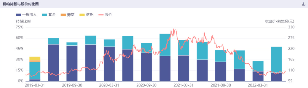机构持股占比从2021Q1开始连续5个季度下滑,到今年一季度末只有28.04%。当然,因为一季度和三季度末公募基金仅披露前十重仓股,这使得机构持股占比很难与中报和年报相提并论。但下降的态势是确定的。