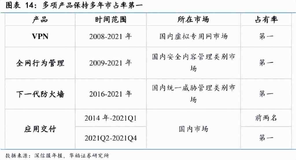 让各路资本相爱相杀的深信服是我国网络安全龙头,主要产品VPN、上网行为管理、应用交付、下一代防火墙等核心产品连续多年市场份额位居行业前两名或第一名,连续4年入围了Gartner国际魔力象限,其中下一代防火墙在2021年首次入围Gartner“远见者”象限。