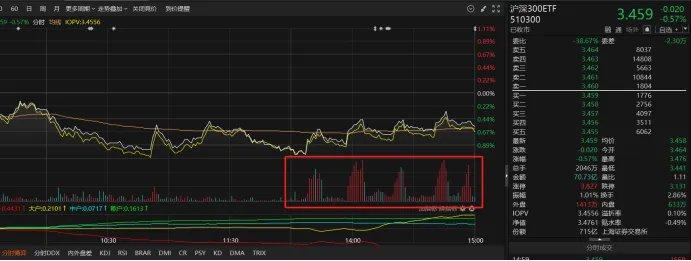 据统计,7月25日午后,有4只沪深300ETF集体放量,其中华泰柏瑞沪深300ETF(510300)午后成交超24亿元,嘉实沪深300ETF(159919)易方达沪深300ETF(510310)午后成交超7亿元,华夏沪深300ETF(510330)午后成交超3亿元,以上4只ETF午后成交均超出上午半天成交金额。这样的买入在当日达到了5次,但明显可见的是,买入反弹后便快速出现了下挫。