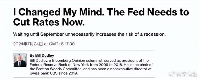 上周三的纳斯达克大跌其实已经是弱化“特朗普交易”后的结果。这里关注到了一篇文章,是当天在华尔街疯传的一篇文章,发布者是“曾经的美联储三号人物”曾执掌纽约联储的杜德利(Bill Dudley)的:“我改变主意了,美联储应该立刻马上降息,最好下周的利率会议上就开始”。