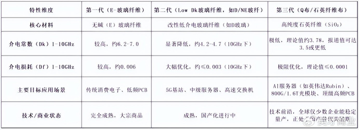第三代电子布(如Q布、扁平布):在第二代基础上,通过极致细纱化、扁平化织造等工艺,进一步显著降低介电常数(Dk)和介电损耗(Df)。其核心逻辑在于:更细、更扁平的纤维纱线意味着树脂浸润更充分,形成的界面更均匀,从而极大减少了信号传输中的能量损耗和延迟,满足800G/1.6T光模块、高端交换机、更高端的AI算力服务器、载板等对超低损耗PCB的刚性需求。