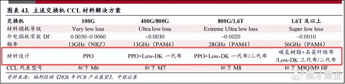 目前英伟达与谷歌先后代表着GPGPU和ASIC两条算力服务器的路线,分歧虽不小,但无论下游GPU和ASIC的竞争格局如何变化,AI Infra追求更高计算效率和更大互联带宽的趋势是不变的,而这背后是技术对硬件材料升级的需求,其实也是AI算力的硬件向着更高密度、更高频率、更低损耗演进过程中的必然选择,所以说未来产业链会对上游低介电性能材料的技术探索将是可持续的。从券商研报的表格中,明显可以看出的趋势是:随着交换机速率的不断提升,对覆铜板和电子布的介电损耗(Df)要求越来越高。