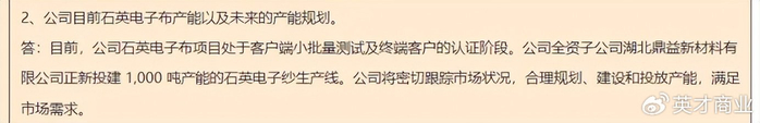 但从12月18日的投资者管理互动上,菲利华披露了产能布局,提到了湖北鼎益的产能规划,而这个湖北鼎益新材料是2025年菲利华新成立的全资子公司,正是为了卡位高端电子布产业,目前正在投建的1000吨产能的石英电子纱产线,按照良率转换,预计高端的石英纤维电子布产能在1000万米-1500万米左右,供给端放量预期较强。