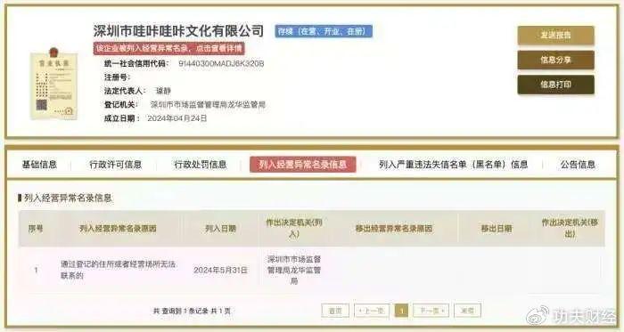 说搞了个深圳哇咔咔文化公司,她占90%股份,也就基本上是个人独资公司了,现在的情况是这样的: