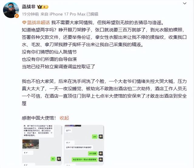 无论你是蓝战非,还是普通打工人,只要人在外面,最重要的是活着回来。钱是小事,命是大事。名声是虚的,安全是实的。