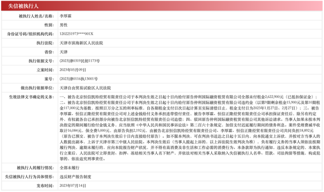 7月14日,中国执行信息公开网信息显示,因被执行人履行情况全部未履行,李厚霖被天津市滨海新区人民法院列为“失信被执行人”,又成了一个“老赖”......