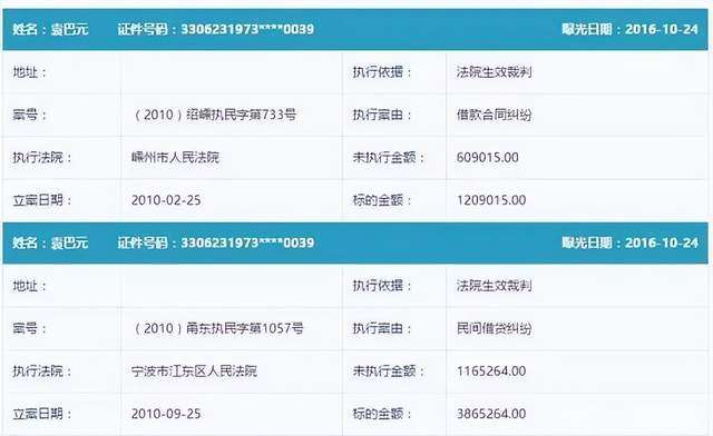然而,新婚不到一个月,袁巴元就被曝出“老赖”事件。浙江法院公开网“曝光台”显示,证件号码为“3306231973****0039”的“袁巴元”共有两笔借款纠纷,涉案金额分别为120.90万元、386.52万元。因此,袁巴元还被列入嵊州市人民法院关于开展“追赖大行动”的追逃名单。