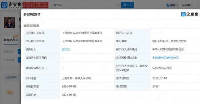 企查查APP显示,袁巴元新增一则股权冻结信息,冻结股权标的企业为上海城外投资有限公司,执行法院为上海市第一中级人民法院,冻结日期自2020年7月10日至2026年7月2日,公示日期为2023年7月3日。