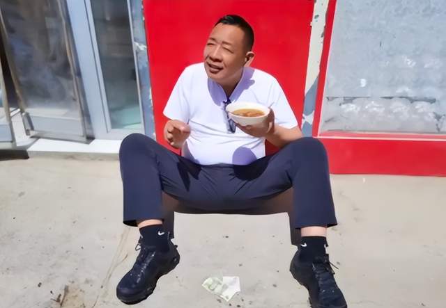 最夸张的,还是端着一碗吃的,在包子铺前席地而坐,面前还被人“摆着”两块零钱。