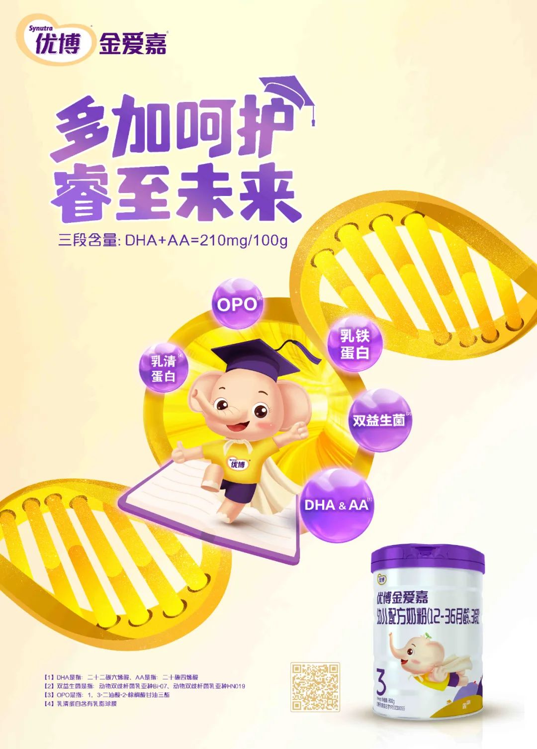 同时,得益于创新研发蓄力,新国标焕新升级“金”牌配方:针对宝宝智力发展的关键需求,优博金爱嘉添加更高含量的DHA+ARA(共计达270mg/100g)、乳脂球膜、胆碱、牛磺酸等17大黄金益智营养;针对宝宝消化吸收和免疫等方面需求,基于优博仿生配方®,精确提高了OPO的含量,并添加三“益”营养(包括两种益生菌和益生元)、活性乳铁蛋白等丰富的营养成分。