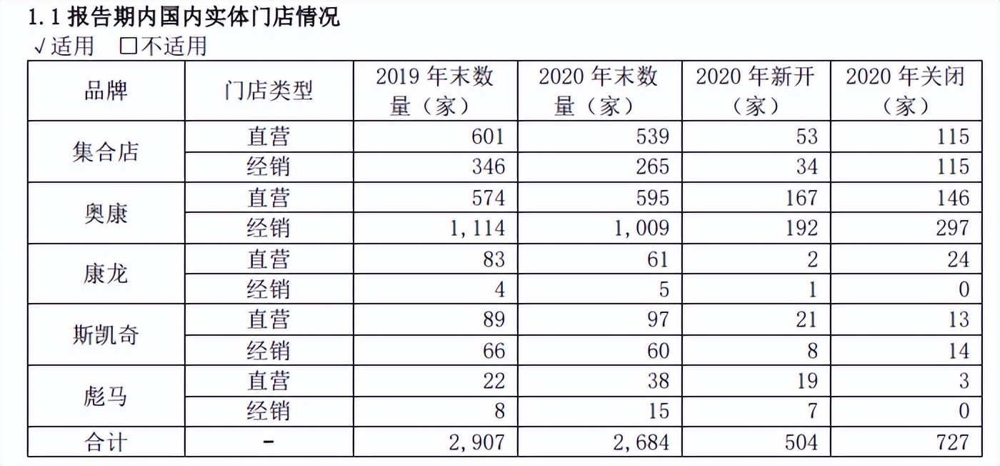 奥康国际2020年报显示,当年末斯凯奇品牌直营门店数97家,经销商门店60家,合计157家。而2017年直营店124家,加盟商29家,合计153家。不禁让人疑虑,公司多元化转型效果如何、决心有多大?