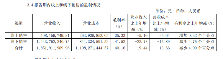 渠道方面,线下销售额下滑较严重,营收10.45亿元同比下降20%。毛利率减少4.98个百分点。特别是直营店,上半年关店量244家,营收降至6.54亿元,同比下降20.15%。
